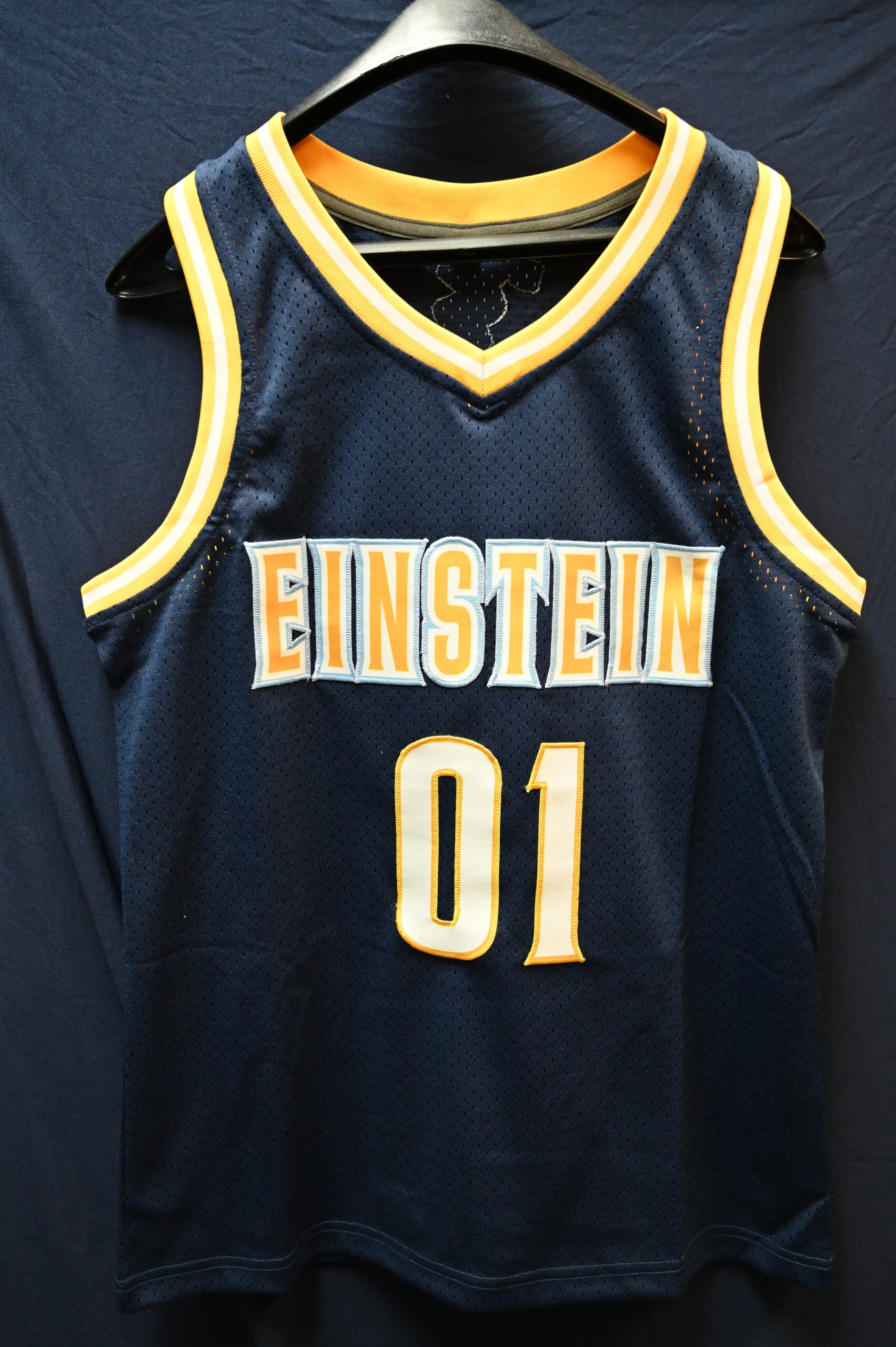 Our new basketball jersey is customizable! You can customize our Einstein Basketball Jersey with your favorite number (11 is the only number that is not available) and your name for an additional $12.50. Select “Yes, I want it customized” in the dropdown and email your customization information and order number to einsteinspiritwear@theeinsteinschool.com.